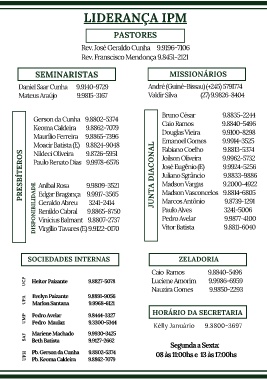 PRESBÍTEROS Paulo Renato Dias 9.9978-6576 JUNTA DIACONAL José Eugênio (E) 9.9924-5256